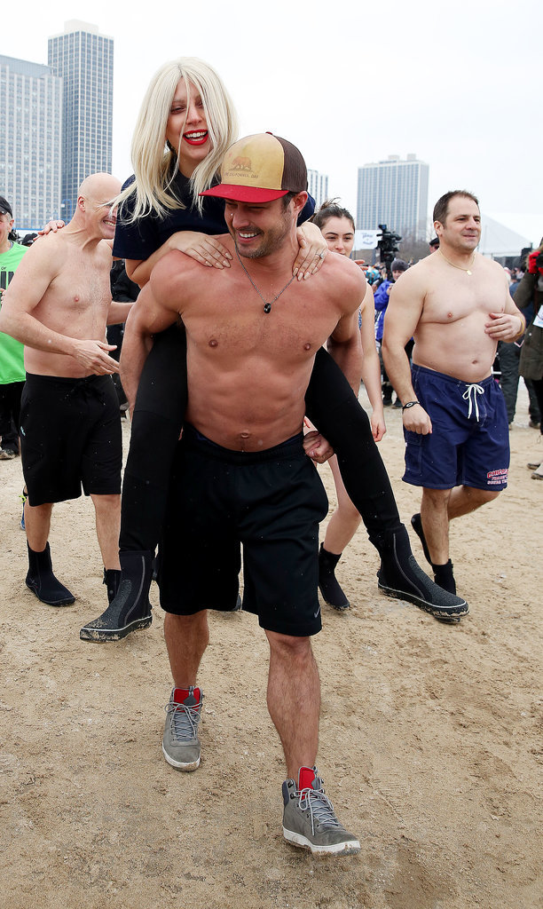 Just because Lady Gaga and Taylor Kinney are settling down doesn't mean the singer and actor are losing their sense of adventure. On Sunday, the duo took part in Chicago's Polar Plunge, jumping into icy Lake Michigan with several people, including Vince Vaughn. Not only did the event raise money for Special Olympics, but it also gave us a high dose of eye candy. Taylor, whose physique can be seen on NBC's Chicago Fire, was shirtless upon arrival. Even better: the actor's muscles were bulging as he carried Lady Gaga on the beach and goofed around with pals in a manly wrestling match. Although you wouldn't expect glamour at such an event, Lady Gaga's red lipstick looked perfect even as ice stuck to her hair.